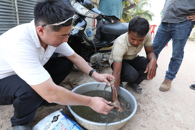4月22日,葡京官网澜湄稻渔项目组与柬埔寨农林渔业部THAY Somony处长带来的技术团队一起走访了Takeo省的三处“水稻—罗氏沼虾”示范养殖基地,并采集了罗氏沼虾和水体样品。在Sab Sarun先生的稻渔养殖基地,吴旭干为当地近30位农民进行了“水稻—罗氏沼虾共生技术”的培训,当地农民和渔业技术推广人员就相关问题和专家们进行了深入交流。项目组给当地10位技术示范户赠送了2.5吨虾类饲料,并赠送了项目组编写的柬埔寨文版“Takeo省水稻—罗氏沼虾共生技术规程”,受到当地农民和渔技人员的热烈欢迎。农户表示希望学习和尝试稻虾种养技术,逐步走上致富道路。