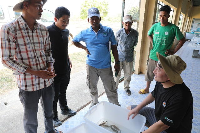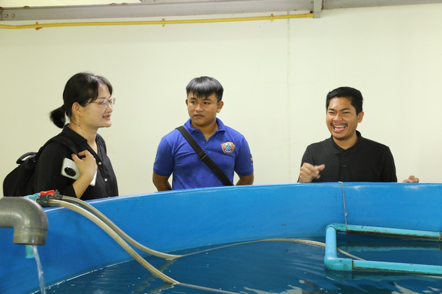项目组在柬埔寨国家水产养殖研究与发展研究所交流罗氏沼虾育苗