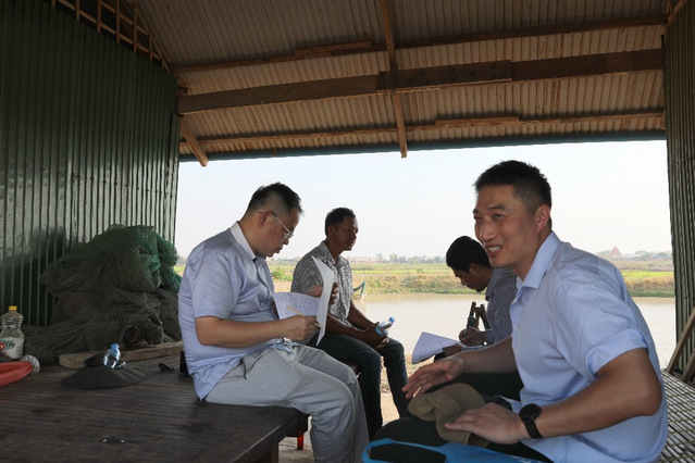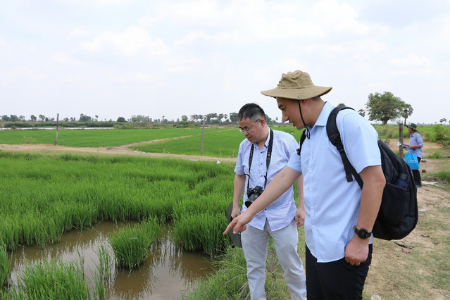 4月23日-24日,项目组先后考察和调研了洞里萨湖周边的社区稻田渔业基地、池塘养殖基地、柬埔寨国家水产养殖研究与发展研究所(NARDI)和宏泰农业产业园等单位,就当地稻田渔业、社区共享水面(池塘)的渔业资源养护技术、农民收入、巴沙鱼和黑鱼养殖、苗种培育、饲料投喂和水质调控等进行了深入调研和交流。项目组向相关单位及人员,介绍了“澜湄稻渔项目”在柬埔寨已经开展和拟开展的工作;根据调研结果和研究经验,项目组对柬埔寨洞里萨湖周边的稻田渔业、社区共享水面管理和池塘养殖品种给出了建议,并赠送了相关资料,邀请当地渔技人员和青年农民到中国进行现场参观和交流,共同提升柬埔寨稻渔和水产养殖产业,逐步实现柬埔寨“鱼米走廊”的建设目标。吴旭干表示:“柬埔寨稻田面积大、年降水量大、温度和光照条件好,故稻渔种养发展潜力很大;但柬埔寨旱季和雨季明显,导致降雨分布不均匀,大部分稻田和池塘基础设施较差,缺乏灌溉系统和电力供应,同时也缺乏养殖物资和技术人员,因此发展稻渔产业也面临诸多挑战;中国具有2000年的稻渔种养传统,目前中国稻渔产业链健全,具有较强的研发力量和技术推广经验,通过中柬深度合作可以加快柬埔寨‘鱼米走廊’的建设步伐。”