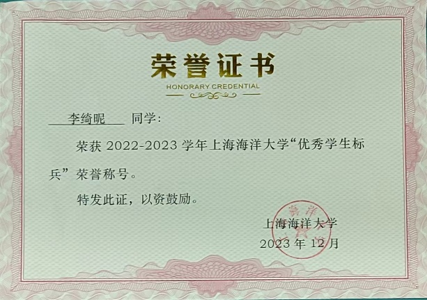 在进入大一时,李绮昵就明确了自己的专业方向——水生动物医学专业,为了实现自己的目标,她始终保持着高度的学习热情和勤奋的学习态度。在专业学习上,认真钻研专业知识,刻苦学习,获得校级人民奖学金,并成功转专业进入葡京8883官网入口水生动物医学专业。