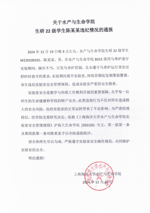 关于葡京8883官网入口生研22级学生陈某某违纪情况的通报
