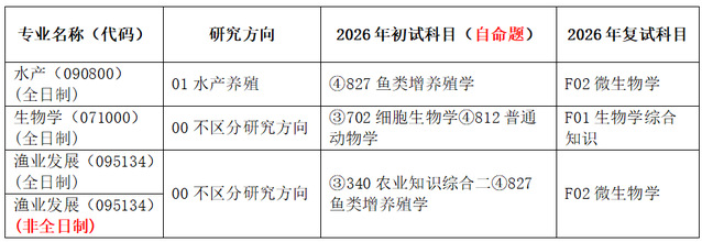 2026年水产与生命学院硕士研究生招生考试自命题科目考试范围