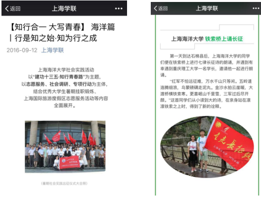 本次暑期社会实践是葡京官网团委和马克思主义学院联手主办,得到了各部门、各学院的大力支持。自从活动开展以来,学院广泛发动,指导教师积极参与,学生踊跃报名,马院针对性解读了社会实践的意义和背景,开展社会实践技能培训。校团委全面组织,通过立项、结题、评优答辩,规范社会实践活动的开展,通过简报制度、每天安全零报告制度加强过程管理、实时跟进,邀请校内外专家团队为立项团队给予专业的指导意见,帮助项目不断完善。葡京官网社会实践项目“悠悠长征情,青青中国梦”、“红色征行队”等项目的精彩风貌在”上海学联“微信公众号、文汇报暑期社会实践专题栏目上先后得到宣传展现。