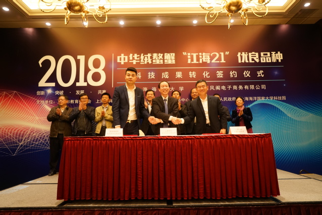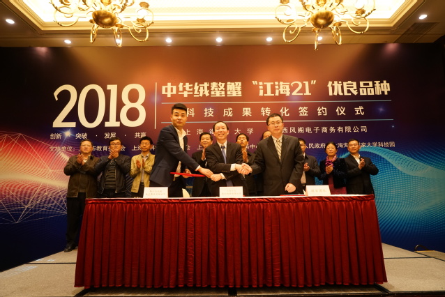 副校长、上海水大技术转移有限公司董事长李延臣与苏州西风阁电子商务有限公司董事长姚远签订了产学研合作协议,上海水大技术转移有限公司总经理吴炯华与苏州西风阁电子商务有限公司总经理权辉、上海农业发展有限公司董事长祝逸明签订了“江海21”品种转让合同,吴炯华还与权辉,葡京8883官网入口教授、“江海21”育种技术路线制定者和实施者王成辉签订了共建“蟹太太”养殖研发中心合作协议。