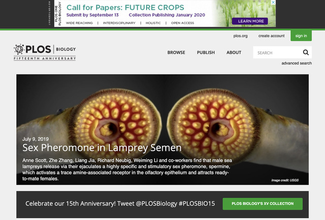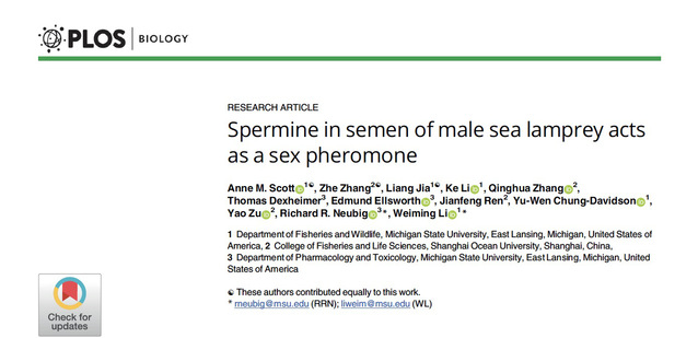 Scott AM*, Zhang Z*, Jia L*, Li K, Zhang Q,Dexheimer T, et al. (2019) Spermine in semen ofmale sea lamprey acts as a sex pheromone. PLoSBiol 17(7): e3000332. https://doi.org/10.1371/journal.pbio.3000332