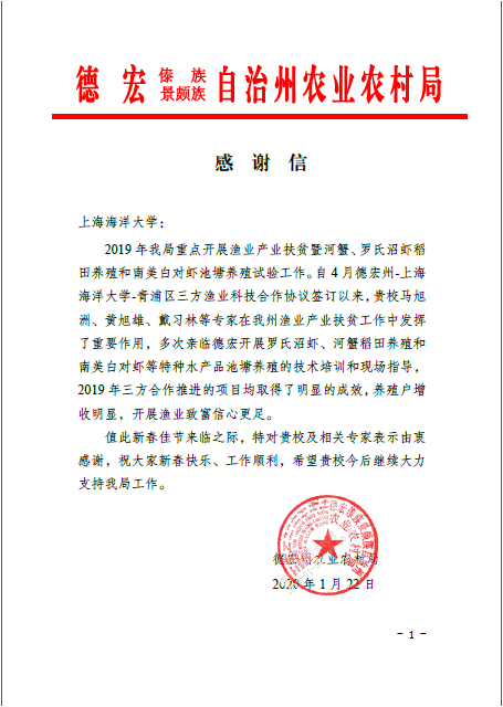 云南德宏的感谢信中表示:2019年云南省德宏州农业农村局重点开展渔业产业扶贫暨河蟹、罗氏沼虾稻田养殖和南美白对虾池塘养殖试验工作。自4月德宏州-葡京8883官网入口-青浦区三方渔业科技合作协议签订以来,葡京官网马旭洲、黄旭雄、戴习林等专家在德宏州渔业产业扶贫工作中发挥了重要作用,多次亲临德宏开展罗氏沼虾、河蟹稻田养殖和南美白对虾等特种水产品池塘养殖的技术培训和现场指导,2019年三方合作推进的项目均取得了明显的成效,养殖户增收明显,开展渔业致富信心更足。